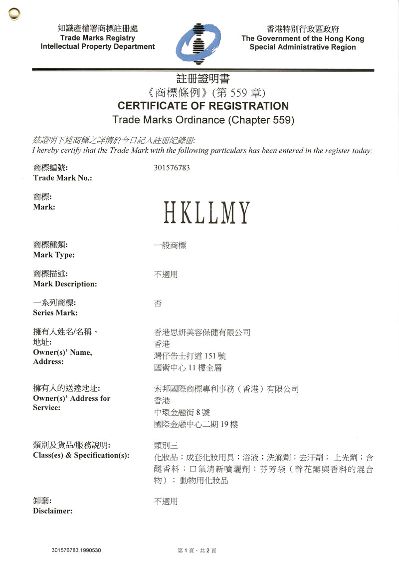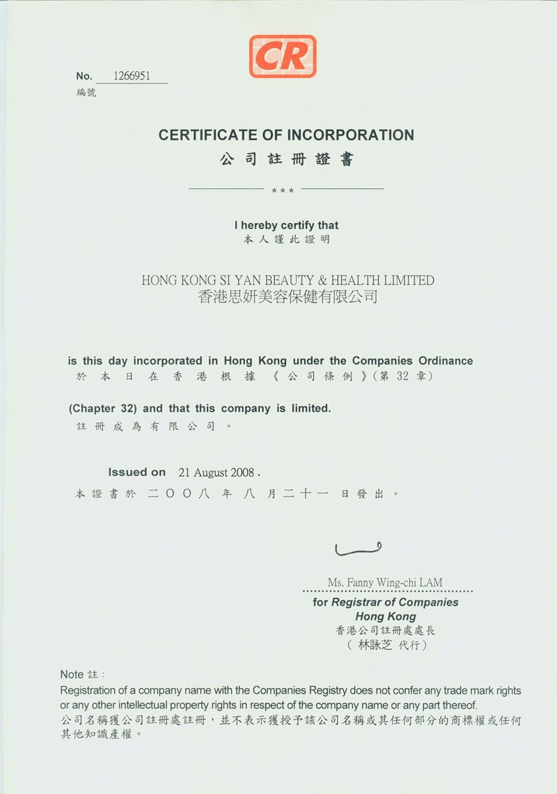 香港思妍美容保健有限公司注册证书