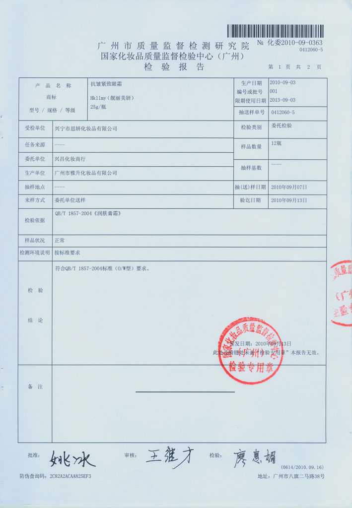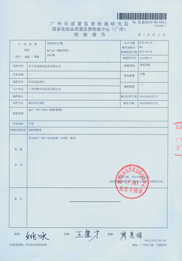 亮润美白日霜质检报告