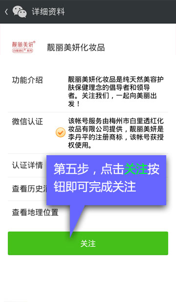 关注【靓丽美妍化妆品】后我们会定期在微信公众平台发布一些优惠信息以及会员活动,您还可以在这里获得第一手的美容护肤时尚资讯,如果您有一些肌肤问题的困扰想寻求咨询,或者只是想找个谈心的对象聊聊工作生活情感上的酸甜苦辣,都可以在微信给我们留言,我们一定会第一时间给您回复的哈。如果你懒得打字,你也可以直接发送语音信息的哦,我们的机器人客服会自动把语音信息翻译成文字告诉我们的,当然咯,您的普通话一定要标准,不然我们的小机器人会脑筋短路的哈哈。